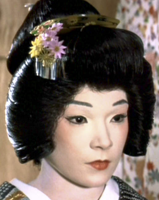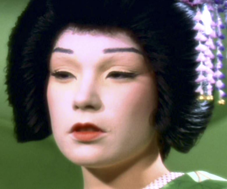 The Japanese disguise and Geisha makeup by Wally Westmore and Shu Uemura was better than many attempts at making up white Americans as Japanese/Chinese characters (but she still looked like Shirley MacLaine). With the eye-tabs pulling her eyes upwards, this was a particularly uncomfortable makeup. Junjiro Yamada was the wig maker.